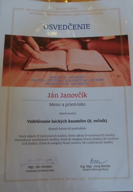 Dňa 8. októbra 2023 sa v kostole bysterského cirkevného zboru uskutočnila milá slávnosť. Odovzdávanie osvedčení ďalším absolventom Biblickej školy. Medzi sebou sme privítali zástupcu biskupa a predsedu Správnej rady Biblickej školy Jána Semjana, riaditeľku Biblickej školy p. farárku Andreu Korečkovú a vyučujúcich seniora Ondavsko-hornádskeho seniorátu Juraja Brecka a p. farárku Mariannu Slávikovú.